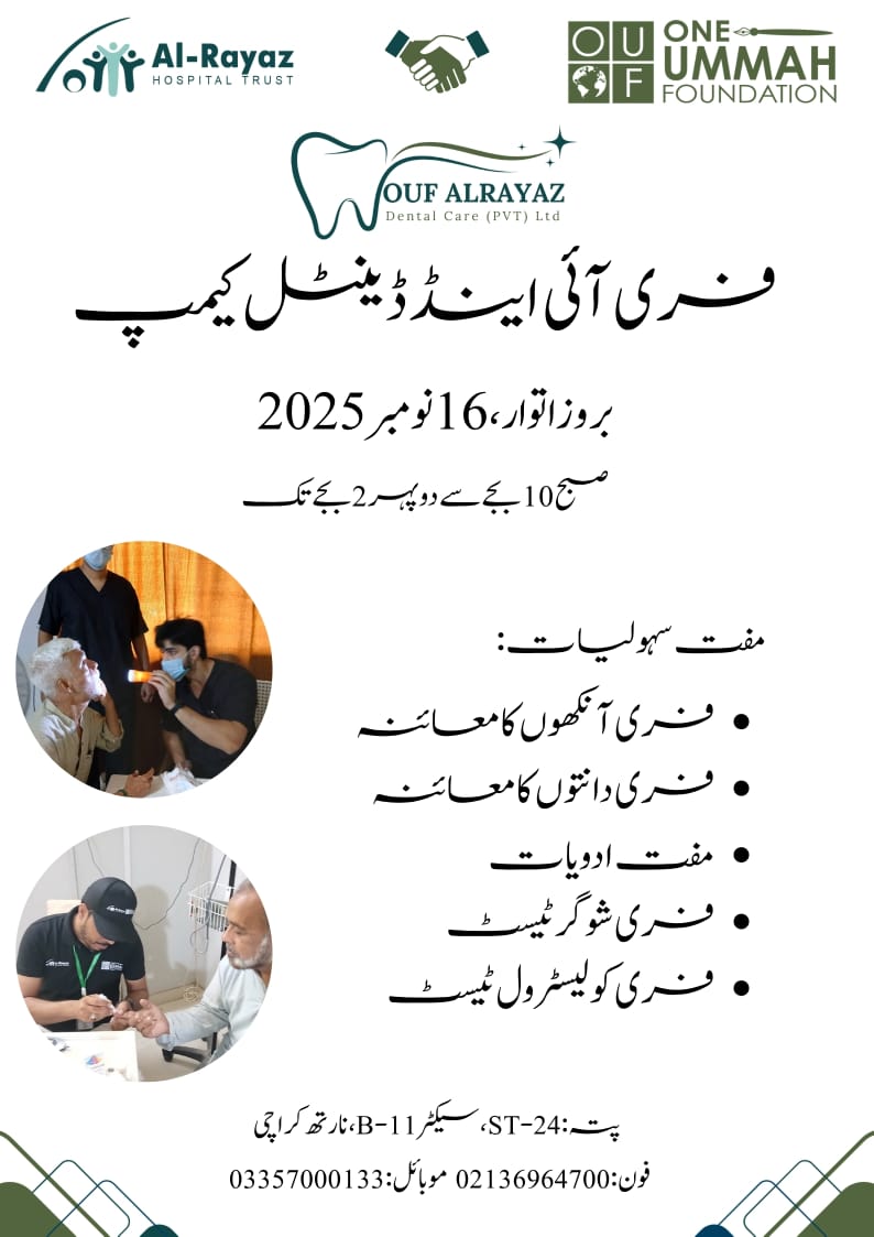 Date: Sunday, 16th November 2025Time: 10:00 AM to 2:00 PMLocation: ST-24, Sector B-11, North KarachiAl-Rayaz Hospital Trust, in collaboration with OUF Al-Rayaz Dental Care (PVT) Ltd and One Ummah Foundation, is proud to announce a Free Eye and Dental Camp